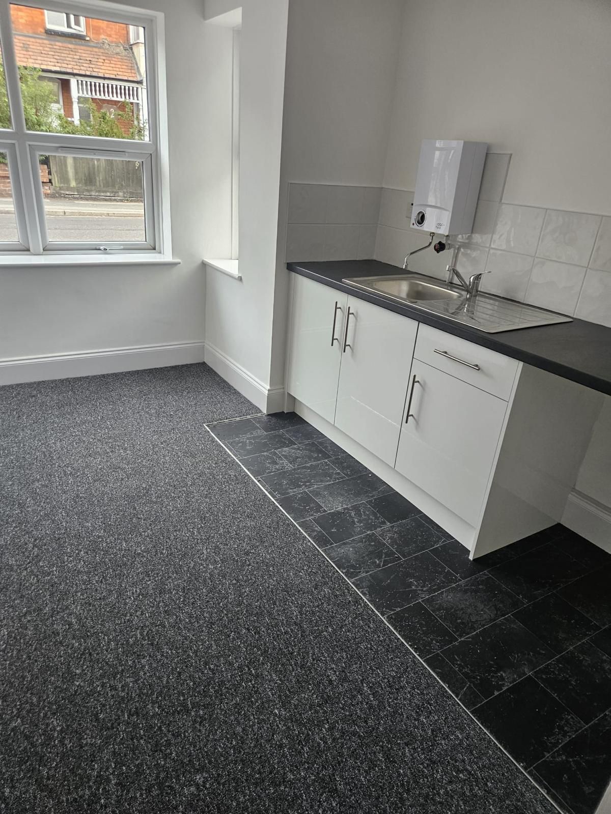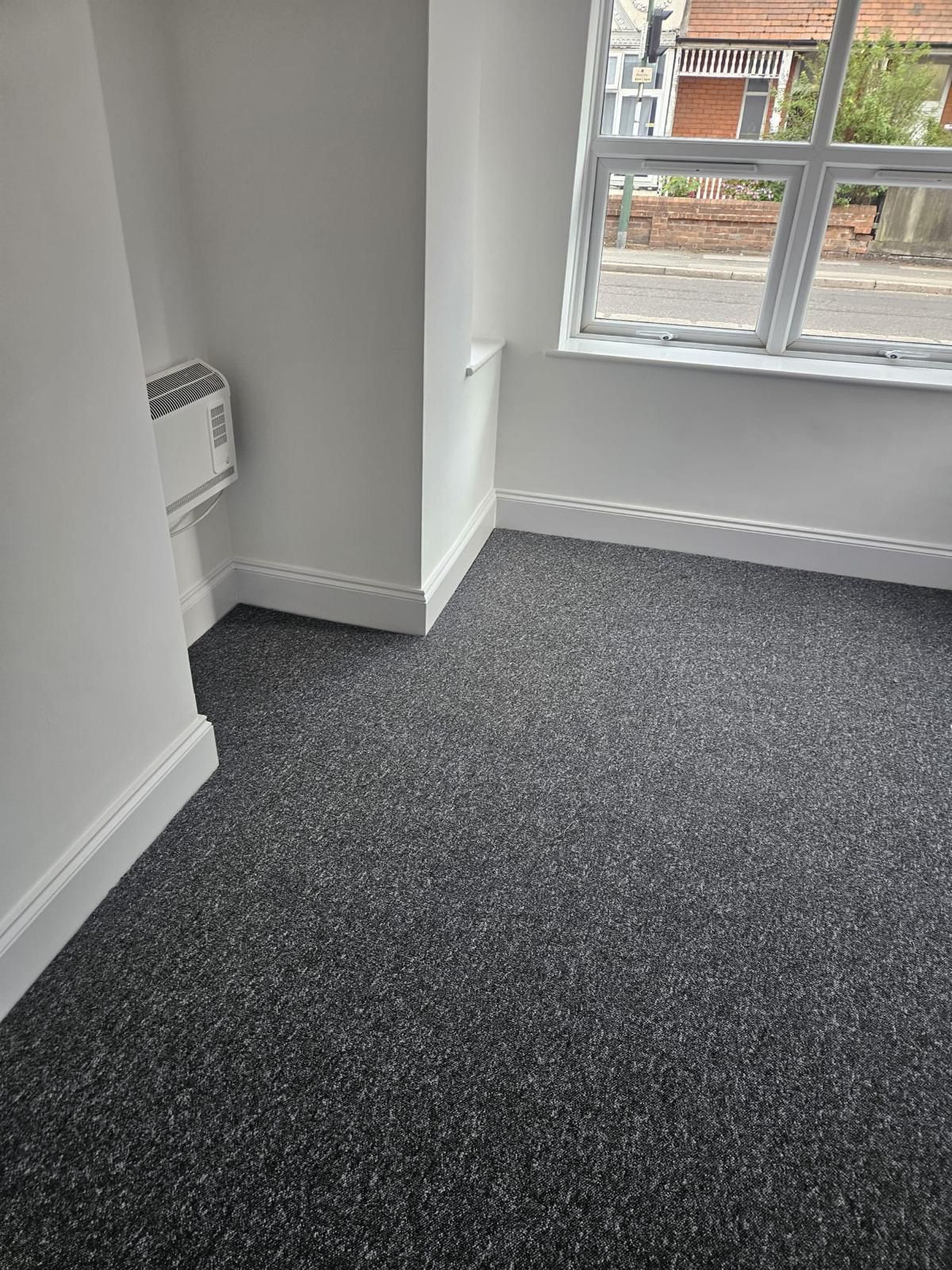 All existing flooring was removed, with new carpets installed in the living space and new vinyl fitted in the kitchen area. The project was completed with full redecoration in a white matt finish, leaving a clean and modern space ready for use.